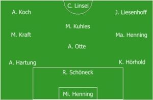 Steinthaleben, bereits in Unterzahl angetreten, hatte wenig entgegenzusetzen. Kurz nach Anpfiff der Partie verletzte sich ihr Kapitän B. Pfefferkorn unglücklich. In der 8. Spielminute traf Markus Henning per Flugkopfball, nach Flanke von Kraft, zunächst nur die Unterseite des Querbalkens. Doch der Ball gelang zu M. Kuhles und der schoß von der Strafraumgrenze das 1:0. Bereits 3 Minuten später traf Jörg Liesenhoff nach Pass von Kuhles (2:0). Einen Eckball konnte Torwart Vollroth nur nach vorn abklatschen, Benno Radecke kam an den Ball und schob zum 3:0 ein (19. min). Ein Gewühl im 5-Meter-Raum nutzte Markus Henning für seinen Treffer zum 4:0 (22. min). Die Gäste waren, bedingt durch die Unterzahl, selten am Zug. Schüsse aufs Tor kamen hauptsächlich durch S. Wagner oder per Freistoß durch M. Koch. In der 35. Spielminute war es wieder Mirko Kuhles der mit Fernschuss zum 5:0 einnetzte. Einen Querpass von Jörg Liesenhoff nutzte Andreas Koch zum 6. Treffer des Spiels (36. min). Einen Rückpass von Schleicher verwertete Liesenhoff zum 7:0 (37. min). Kurz vor der Pause schraubten Kuhles (44. min, 8:0) und Koch (45. min, 9:0) das Ergebnis weiter in die Höhe. Nach der Pause kamen die Spieler Steinthalebens nicht mehr aufs Spielfeld zurück.