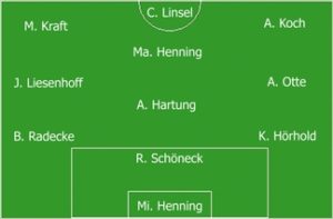Das Spiel begann mit einem Freistoß für Badra. Kapitän Liesenhoff trat an, „Fritze“ Linsel köpfte und Allmenhausen Keeper Benjamin Knorr hielt (2. min). Die erste Chance der Gäste nutzte Sascha Stöcklein auch gleich zur Führung für den Gastgeber (4. min). Die zweite Chance nutzte Stöcklein effektiv zum 2:0 nur 3 Minuten später. Zwar konnte Badras Michael Henning erst stark agieren, doch der Nachschuss Stöckleins saß. Nun war auch Badra wach und antwortete mit einem Lattenknaller von Mirko Kuhles (9. min). Nach dem ereignisreichen Beginn kam nun erstmal Ruhe in die Partie. In der 26. Spielminute konnte Allmenhausens Schlussmann eine Flanke A. Kochs abwehren, doch beim Schuss von Liesenhoff war er dann jedoch chancenlos (2:1). Nach einer cleveren Freistoßvariante von Kuhles und Liesenhoff konnte Peter Brosch den Ausgleich, durch Schuss von Koch, noch verhindern (30. min). Auf der Gegenseite war es Christopher Pöhlitz, der die Führung hätte ausbauen können (34. min). Die zweite Hälfte begann ebenso ereignisreich wie die Erste. Kraft und Otte mussten gelb-rot gefährdet durch Radecke und Stahl ersetzt werden. Dann legte Daniel Schleicher für Kuhles ab und der traf zum 2:2 Ausgleich (47. min). Eine Freistoß von Kuhles in der 53. Spielminute konnte Torwart Knorr nur mit dem Fuß abwehren und Schleicher staubte zur verdienten 2:3 Führung ab (53. min). Doch nun begann die Zeit des Schiedsrichters. So langsam wurde das Spiel einseitig betrachtet und in der 75. Spielminute wurde ein harmloser Pressschlag von A. Koch mit einem Allmenhausener Spieler, der dadurch den Ball für sich gewann und behauptete, als Foul gewertet. Der darauf gegebene Freistoß brachte dem Gastgeber nichts zählbares, doch ein Zweikampf an der Strafraumgrenze wurde wieder als Foul angesehen und diesesmal nutzte Michael Fricke diesen zum 3:3 Ausgleich (76. min). Badra nun geschockt. In der 81. Spielminute stand wieder der Schiedsrichter im Mittelpunkt. Allmenhausens Dorl stand einige Meter hinter Badras letzten Mann Schöneck, die Flanke kam und konnte völlig frei per Kopf verwertet werden (81. min). Die kuriose Entscheidung des Schiris – Tor! Badra war bedient und es folgte nach unnötigem Foul noch ein Strafstoß für den Gastgeber. Doch Henning zeigte noch einmal seine Klasse und parierte gegen Th. Schmidt (91. min).